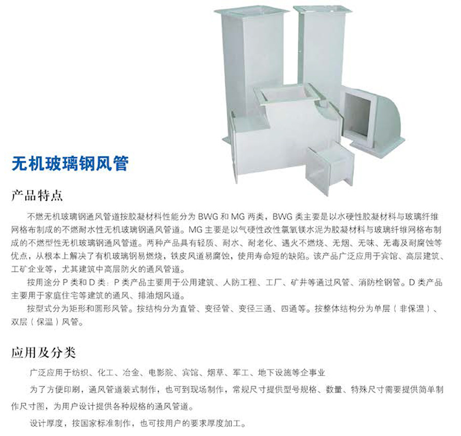 玻鎂復合風管板材表面光滑、平整,漏風率僅為一般風管的5%,大大提高了空氣輸送效率。在生產、制作、安裝、使用此產品過程中,玻鎂復合風管均不生產對環境有害的物質,不生銹、不發霉、不積塵,無玻璃纖維風管的粉塵和纖維;無異味,導熱系數低,保溫性能極佳,具有良好的隔音、吸音性能,無鐵皮風管收縮和擴張時產生的噪音;不燃、抗折、耐壓、吸水率小、溫膨脹低,無吸潮變形現象,使用壽命長達20年。玻鎂風管作為普及型產品不僅滿足了市場對傳統產品的需求,同時,通過提高無機復合材料的節能、防火和環保指標參數,實現了無機復合風管的性能升級。此產品已通過“國家防火建筑材料質量監督檢驗中心型式檢驗”,“國家建筑材料測試中心型式檢驗”,獲得了“建材燃燒性能等級(GB8624A級)標識”。 玻鎂風管可用作于各類暖通空調通風管,防排煙風管等。與傳統無機復合風管比較,玻鎂復合風管具有顯著的性價比優勢,市場前景廣闊。
