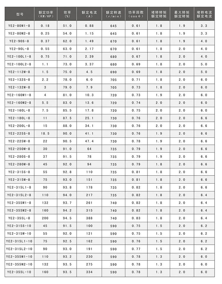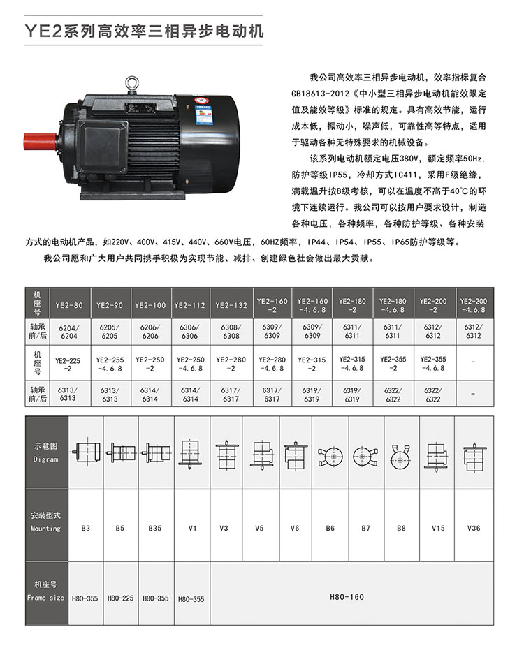 我公司高效率三相異步電動機,效率指標(biāo)符合GB18613-201《中小型三相異步電動機能效限定值及能效等級》標(biāo)準(zhǔn)的規(guī)定。該系列電動機具有高效節(jié)能,運行成本低,振動小,噪聲低,可靠性高等特點,適用于驅(qū)動各種無特殊要求的機械設(shè)備。 該系列電動機額定電壓380V,額定頻率50Hz,防護等級IP55,冷卻方式IC411,采用F級絕緣,滿載溫升按B級考核,可以在溫度不高于40℃的環(huán)境下連續(xù)運行。我公司可以按用戶要求設(shè)計,制造各種電壓,各種頻率、各種防護等級、各種安裝方式的電動機產(chǎn)品,如220V、400V、415V、440V、660V電壓,60Hz頻率,IP44、IP54、IP55、IP65防護等級等。 我公司愿和廣大用戶共同攜手積為實現(xiàn)節(jié)能、減排、創(chuàng)建綠色社會做出大貢獻。