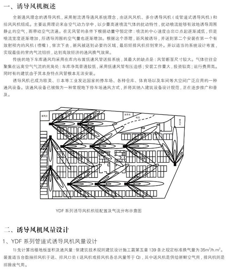 YDF系列誘導風機根據用戶不同的需要可分為兩種類型,即YDF-A系列管道式誘導風機和YDF-B系列多風機式誘導風機,管道式誘導風機由高壓風機、 小口徑螺旋風管和噴嘴組成;多風機式誘導風機由臺超薄型風機和噴嘴組成。 傳統的地下車庫通風均采用在庫內布置低速風管送排風系統,其最大的缺點是:風管斷面尺寸較大,氣體往往會聚集在遠離空氣氣流的死角處;車庫凈高普通較低,采用低速風管有壓迫感;安裝工作量大,投資較高;運行費用高。同時有的建筑由于其本身特點風管根本無法安裝。 誘導風機已成為歐美、日本等工業發達國家的停車場、各種倉庫、體育場以及車間等大空間廣泛應用的一種通風設備。該通風設備已被做為一種常規地下停車場通風方式,并將其納入建筑設備設計規范,正在逐步推廣和普及。