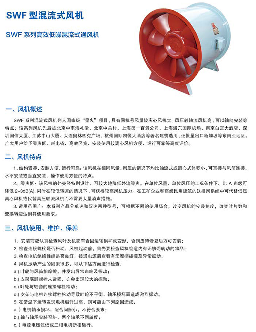 【SWF(B)】系列低噪節(jié)能混流通風(fēng)機(jī)是介于軸流式和離心式通風(fēng)機(jī)之間的一種新型風(fēng)機(jī),具有離心式風(fēng)機(jī)的高壓力,軸流風(fēng)機(jī)的大流量,效率高,節(jié)能好,噪聲低,安裝方便等特點(diǎn)。風(fēng)機(jī)設(shè)計(jì)新穎,結(jié)構(gòu)緊湊,體積小,重量輕,易安裝,風(fēng)機(jī)可聯(lián)接管道和安裝在空調(diào)箱內(nèi)。低壓離心風(fēng)機(jī),廣泛用于工業(yè),民用建筑通風(fēng)除塵等。HL3-2A系列混流通風(fēng)機(jī)廣泛用于隧道、地下車庫(kù)、高級(jí)民用建筑、冶金、廠礦等場(chǎng)所的通風(fēng)換氣及消防高溫排煙,特殊環(huán)境可選用防爆型混流風(fēng)機(jī)。